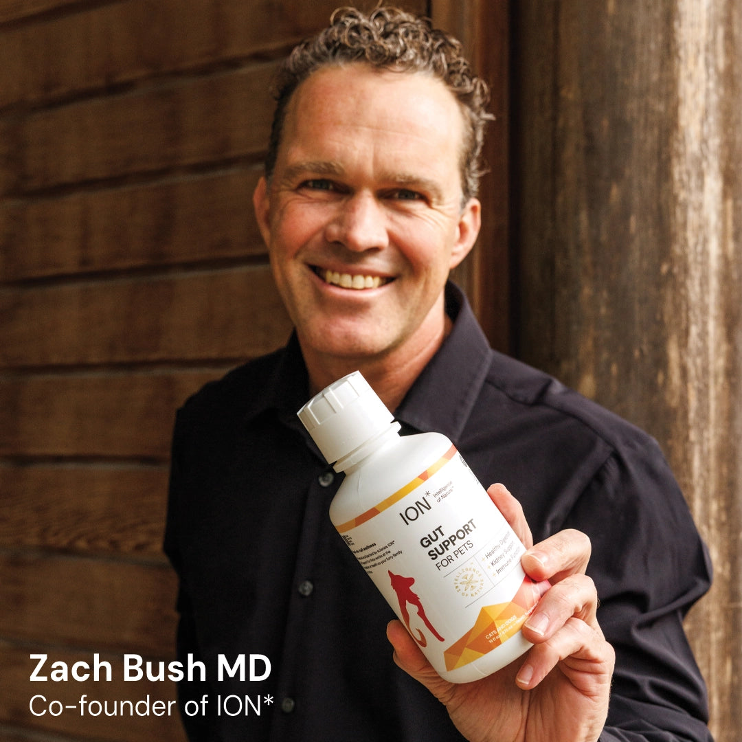 ION* Gut Support For Pets is an all-natural liquid gut health supplement that helps strengthen cells in the gut lining and diversify your pet's microbiome naturally. It is made with humic extract, silicon, trace minerals, and filtered water. It is soil derived, U.S. sourced, and certified glyphosate residue free.